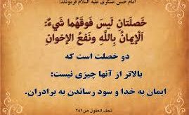 – سود رساندن به مردم در کلام امام عسکری(ع) امام عسکری (ع) فرمود: خِصلَتانِ لَیسَ فَوقَهُماشَیءٌ اَلایمانُ بِاللهِ وَ نَفعُ الاِخوانِ تحف العقول ص۴۸۹ دو خصلت است که چیزی بالاتر از آنها نیست یکی ایمان به خدا ودیگری سود رساندن به برادران دینی. مومن همواره تلاش می کند ایمان خود …