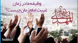 وظائف ما در زمان غیبت : ۱ – معرفت وشناخت درست آن حضرت ۲ – تلاش بر صیانت ایمان ودین خود ۳ – انتظار وآمادگی لازم برای ظهور ۴ – دعا ) برای تعجیل فرج ، سلامتی آن حضرت و برای حفظ دین خود. ۵ – تزکیه نفس …